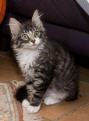 Freddie ist der jüngste der "Sieben Zwerge", er kam im August 2008 zu uns. Grund für diesen Neuzugang war, dass wir uns dachten, dass unser Ozzie unbedingt einen kleinen Spielkameraden haben sollte. Er war zu der Zeit ja unser "Jüngster" und fand mit seinem Spieltrieb nicht so rechten Anklang bei den "Großen". Deshalb gingen wir wie üblich ins Bielefelder Tierheim und wurden dort gleich mit einem Handyfoto von Freddie konfrontiert. Was wir dort sahen, einen kleinen Main Coone Kater, ließ uns die Entscheidung leicht fällen, ja, den wollten wir haben. Und wenn wir uns heute so ansehen, wie supertoll Freddie und Ozzie zusammen spielen und das Haus auf den Kopf stellen, dann war die Entscheidung goldrichtig. Wieviel Main Coone in Freddie steckt, wissen wir nicht, weil auch er ein Fundtier des Tierheims war. Aber so, wie es aussieht, steckt davon jede Menge in ihm und seinem imposanten Puschelschwanz ;)