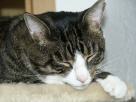 Sternchen, unser "Sozialkater" - der verträglichste und gemütlichste von allen Sternchen haben wir im Sommer 2002 auf der Internet-Seite des Tierheims Bielefeld entdeckt, da war er ca. 2 Jahre alt. Er war seinem Besitzer weggenommen worden, weil der ihn in einem Wutanfall (Sternchen war zu der Zeit nicht kastriert und deshalb unsauber) aus dem Fenster im 2. Stock geworfen hatte. Als Sterni zu uns kam, war er zum Weinen dürr, aber der freundlichste Kater, der mir je begegnet ist. Die ersten Wochen bestanden nur aus Fressen, Fressen, Fressen. Und heute? Naja, sagen wir, er hat sich figürlich seinen Dosis angepasst ;)