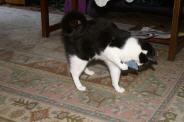Samstag Morgen, 09.00h - Die Minzekissen werden an verschiedenen Orten wieder ausgelegt und erfreuen sich unterschiedlicher Aufmerksamkeit. Durch besondere Brutalität hervor tut sich Juli, der sofort wieder sein wildes Spiel mit der Minze-Maus beginnt.