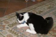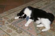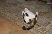 14.36h - Pauli müht sich derweil nach Kräften, das gottlob behoste Bein der Dosine zu erklimmen, um an eines der anderen Kissen zu kommen. Am anderen Hosenbein zerrt Juli vehement und versucht das Gleiche. Dosine wirft Pauli ein Kissen zu. Pauli schnappt sich das Kissen, verdreht die Augen und beginnt, sich verzückt mit dem Kissen in den Vorderpfoten herumzuwälzen. Juli hat derweil der Dosine die Minze-Maus aus der Hand gerissen und rennt mit seiner Trophäe ins Wohnzimmer. Arnold sabbert immer noch.