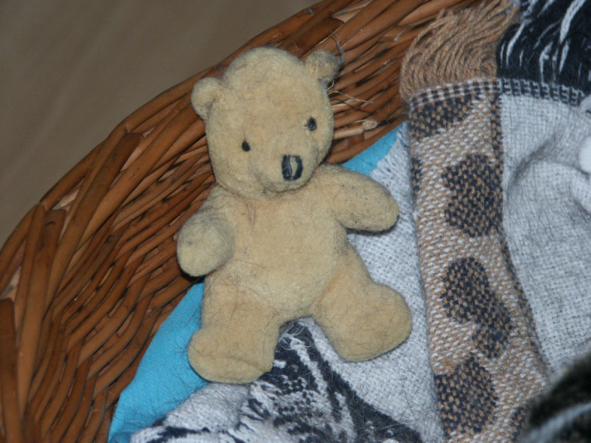 Zunächst bemerkte ich nur, dass Teddy irgendwie immer von seinem Podest herunter auf die Bank fiel und setzte ihn also immer brav zurück. Dann eines Tages war er weg und wurde zwei Tage lang nicht gesehen. Irgendwann hörte ich dann so eigenartig gurrende und gluckernde Katzentöne und als ich denen nachging, entdeckte ich Mäusi mit dem Teddy im Maul, die ihn vorsichtig im ganzen Haus herumtrug und ihm dabei offensichtlich erzählte, wo denn was im Haus zu finden sei.